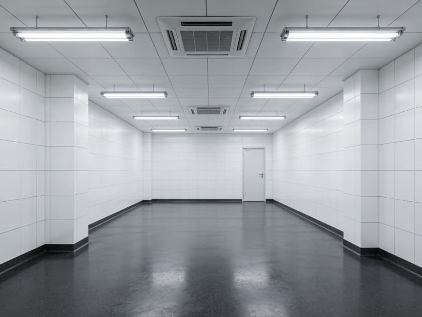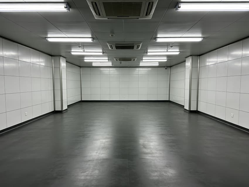 車間內(nèi)部施工工藝凸顯耐腐潔凈特性:地面采用深灰色重防腐環(huán)氧自流平工藝,經(jīng)基層噴砂處理、防腐底漆涂刷、環(huán)氧砂漿找平、自流平罩面四道關(guān)鍵工序,表面平整度誤差≤1mm/m,耐酸堿、耐有機溶劑腐蝕,附著力達(dá)2.0MPa以上;墻面采用白色食品級潔凈抗菌涂層施工,推行無縫拼接技術(shù),陰陽角采用R50圓弧倒角工藝,杜絕積塵死角,涂層硬度達(dá)2H,可耐受高頻次消殺。