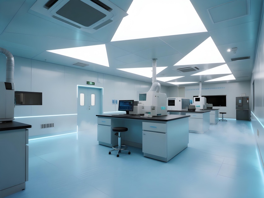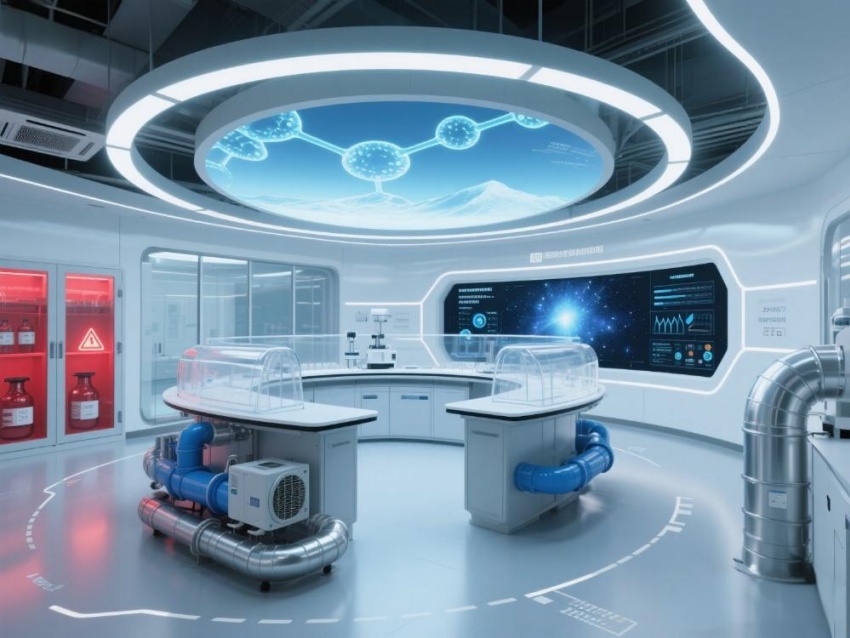 本實(shí)驗(yàn)室以"絕對(duì)環(huán)境控制"為核心設(shè)計(jì)理念,整體采用冰川藍(lán)與鈦白灰的漸變配色。墻面嵌入式環(huán)境參數(shù)監(jiān)測(cè)屏實(shí)時(shí)流動(dòng)著翡翠綠數(shù)據(jù)流,與頂棚矩陣排列的微孔送風(fēng)口形成科技韻律。核心實(shí)驗(yàn)區(qū)采用圓弧形防結(jié)露玻璃隔斷,內(nèi)置百級(jí)潔凈層流罩。地面鋪設(shè)防靜電陶瓷鋼板,接縫處嵌入LED環(huán)境達(dá)標(biāo)指示燈。設(shè)備區(qū)裸露的銀色保溫管道與藍(lán)色冷媒管構(gòu)成工業(yè)美學(xué)展陳,智能除濕機(jī)組通過半透明外殼展示內(nèi)部冷凝過程。數(shù)據(jù)中控室配備270°曲面監(jiān)控屏,懸浮粒子濃度以動(dòng)態(tài)星云圖呈現(xiàn)。空間通過嚴(yán)謹(jǐn)?shù)膸缀畏指钆c流體力學(xué)曲線結(jié)合,在極致環(huán)境控制要求下,打造出兼具科研嚴(yán)肅性與星際艙未來感的頂級(jí)實(shí)驗(yàn)環(huán)境。