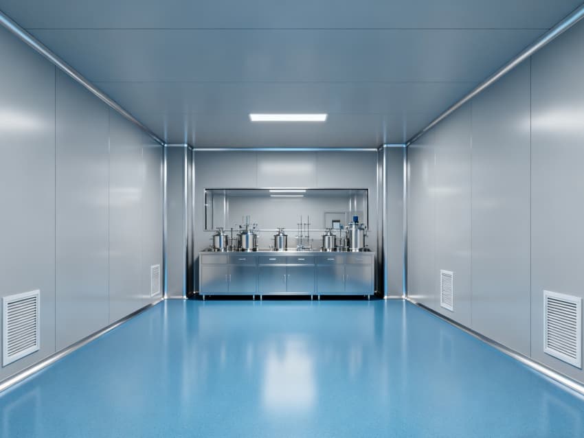 設計在環境防護上針對性突出:地面采用藍色耐腐環氧材質,可耐受酸堿類藥劑侵蝕,且無縫拼接設計便于清潔消毒;四周淺灰色抗菌墻壁采用防霉涂層處理,配合圓弧墻角結構,避免藥液殘留與粉塵堆積,搭配頂部層流送風系統,能穩定維持萬級潔凈度,滿足藥劑配液對微環境無菌性的嚴苛要求。