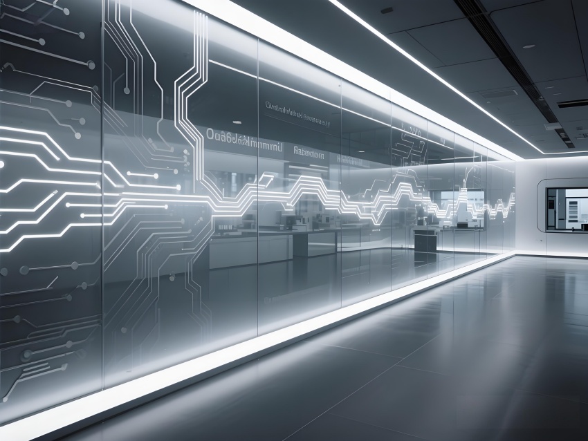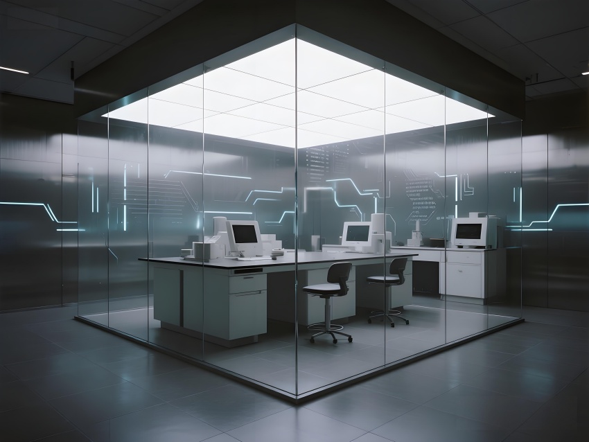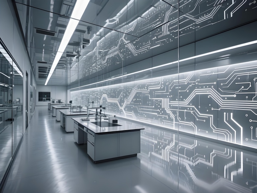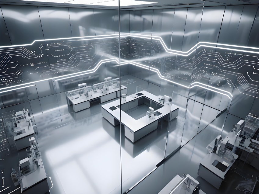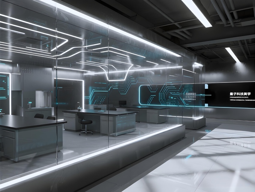 本實(shí)驗(yàn)室采用"量子科技美學(xué)"設(shè)計(jì),將納米尺度的精密感轉(zhuǎn)化為空間敘事。主實(shí)驗(yàn)區(qū)以鏡面銀與深空灰為基調(diào),半透明防輻射玻璃墻體內(nèi)嵌電路板紋理光帶,象征微觀世界的電子軌跡。百級潔凈區(qū)的金色氣流箭頭與千級區(qū)的藍(lán)色光暈形成能級躍遷般的視覺分級,CVD設(shè)備艙的蜂窩狀散熱孔與懸浮式控制面板構(gòu)成未來工廠意象。地面導(dǎo)光纖維模擬分子結(jié)構(gòu)網(wǎng)絡(luò),天花板動(dòng)態(tài)粒子監(jiān)測屏以數(shù)據(jù)流形式投射納米顆粒分布。通過冷調(diào)LED與設(shè)備熒光的層次照明,在滿足EMI屏蔽與化學(xué)防護(hù)需求的同時(shí),創(chuàng)造出如同操作量子領(lǐng)域的沉浸式科研環(huán)境,透明氣閘門上的全息警示標(biāo)志進(jìn)一步強(qiáng)化尖端材料研究的科技儀式感。