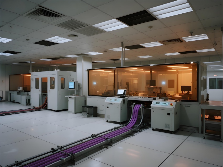 本芯片廠采用"硅基未來主義"設計風格,將納米級制造的精密感轉化為宏大的工業美學。空間以鈦銀與深空灰為主色調,光刻區的琥珀色防霧照明與蝕刻區的冷紫工藝氣體管道形成科技光譜。高架地板下的藍色氣流指示燈模擬集成電路紋路,天花板的矩陣式FFU單元如晶圓陣列般規整。透明設備艙內機械臂的精準運動軌跡,與墻面懸浮的晶圓生產數據流構成動態敘事。防靜電涂層的金屬質感表面反射出潔凈室的無限縱深感,關鍵區的紅色激光定位光幕則強化半導體制造的危險與精確。通過嚴格的功能色彩編碼(黃-光刻/紫-蝕刻/藍-檢測)和極簡的無縫設計,在滿足ISO14644Class1標準的同時,塑造出如同微觀芯片放大至建筑尺度的震撼視覺隱喻。