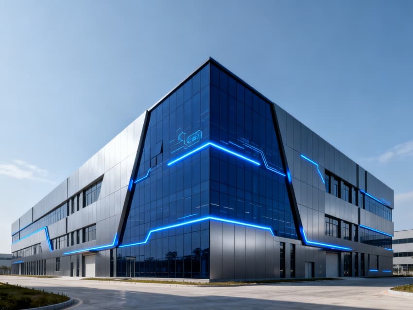 廠房外立面采用銀灰色氟碳涂層鋁單板為主材,搭配窄框雙層中空Low-E玻璃,橫向線條舒展連貫,弱化建筑厚重感;主入口處嵌入暗紋量子電路圖案,既呼應(yīng)產(chǎn)業(yè)屬性又不破壞簡潔基調(diào),同時通過玻璃幕墻引入自然光線,減少室內(nèi)照明能耗,整體呈現(xiàn)冷靜、精準(zhǔn)的科技質(zhì)感。?