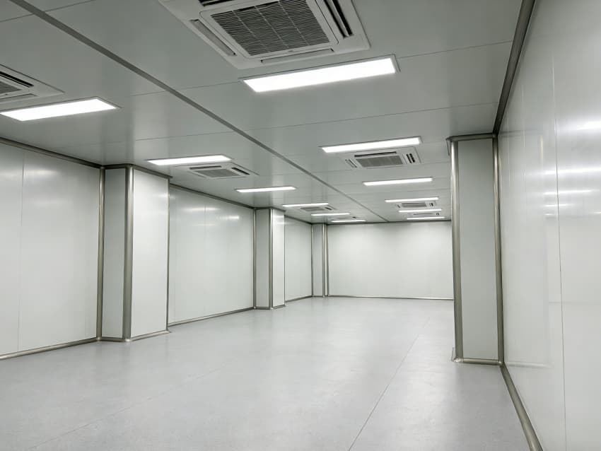 本次呈現的電子精密器件工廠車間以“高精度施工、高潔凈適配”為核心,融合多項專業施工工藝,車間內部施工工藝凸顯精密特性:地面采用淺灰色環氧防靜電自流平工藝,經基層拋丸處理、界面劑涂刷、環氧砂漿找平、自流平罩面四道核心工序,表面平整度誤差≤0.8mm/m,防靜電性能達10?-10?Ω;墻面采用白色潔凈抗菌涂層施工,推行無縫拼接技術,陰陽角采用R50圓弧倒角工藝,杜絕積塵死角,涂層硬度達2H以上,耐受頻繁清潔。