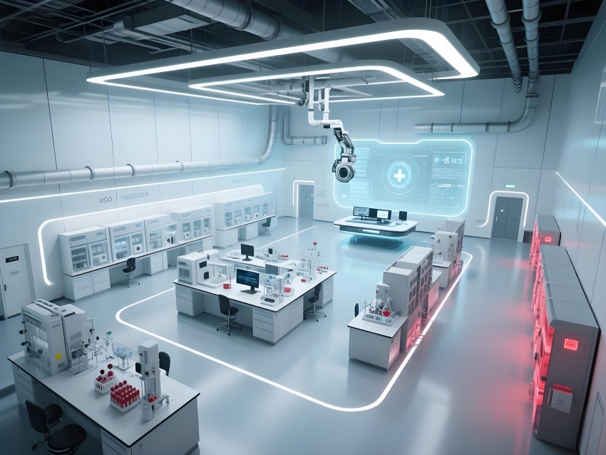 本設計以"科技賦能生命"為核心理念,構建純凈高效的研發環境。主體采用冰川白與醫用藍的漸變配色,墻面嵌入動態生物分子結構LED裝飾,營造科研儀式感。實驗區采用模塊化懸浮工作臺,透明智能玻璃隔斷實現空間通透性與功能分區的完美平衡。頂棚的流線型送風系統與地面熒光導視帶形成立體動線指引。核心無菌區采用圓形穹頂設計,搭配全息投影滅菌提示界面。數據分析中心配備曲面智能白板墻,實時可視化研究數據。?;反鎯^通過紅色光暈警示與物理隔離確保安全。整體空間融合醫療級潔凈美學與科幻實驗室語言,在嚴謹中注入未來感,通過智能交互界面與人性化燈光系統,打造國際一流水準的醫藥研發矩陣空間。