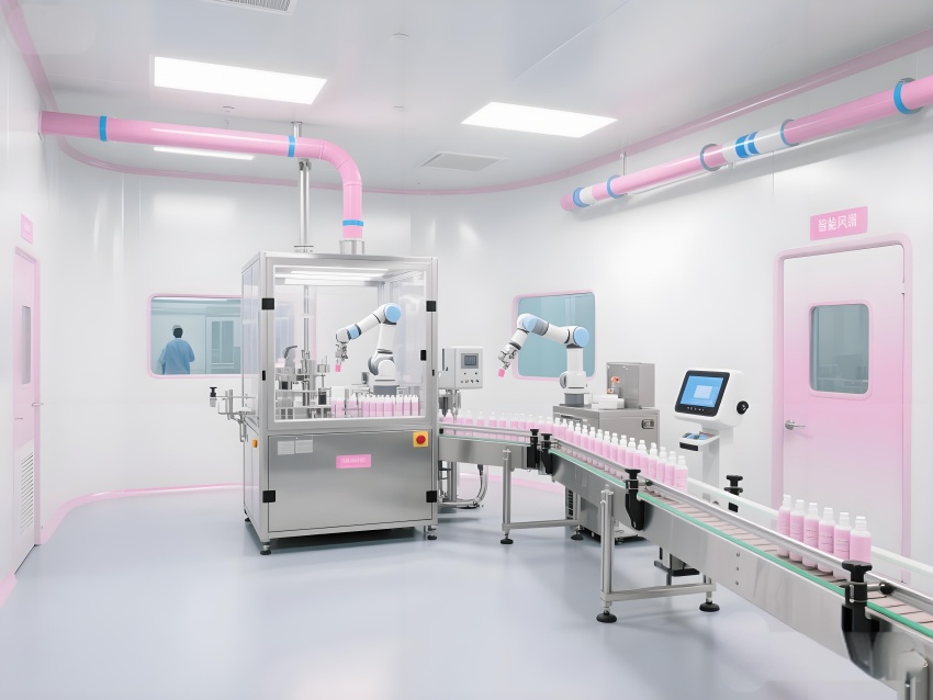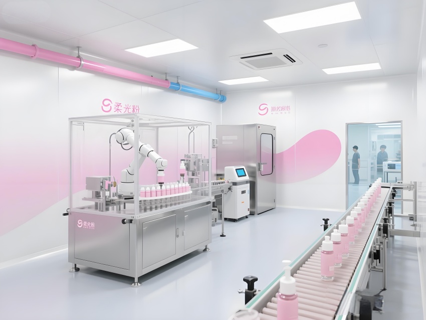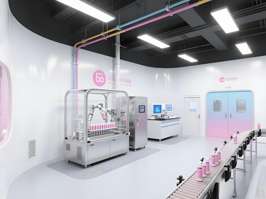 本車間以“科技感純凈美學(xué)”為設(shè)計語言,將化妝品行業(yè)的精致基因融入工業(yè)空間。純白主色調(diào)搭配品牌標(biāo)志性的柔光粉點綴,墻面圓弧過渡的彩鋼板與地面淺灰導(dǎo)靜電地板構(gòu)成潔凈基底。核心灌裝區(qū)透明層流罩內(nèi),機械臂精準(zhǔn)抓取瓶體灌裝,冷銀色設(shè)備與粉色功能標(biāo)識形成視覺對比。頂棚均勻分布的LED平板燈在乳化區(qū)投下無影光效,原料輸送管道通過色環(huán)編碼清晰區(qū)分。質(zhì)檢實驗室的藍(lán)光檢測儀與包裝區(qū)高速傳送帶上的產(chǎn)品流,共同構(gòu)建高效生產(chǎn)韻律。人員通道的智能風(fēng)淋室采用漸變色玻璃,科技感與人性化并存。整體空間通過嚴(yán)格的功能分區(qū)與柔和的色彩管理,打造符合國際標(biāo)準(zhǔn)的化妝品智造殿堂。