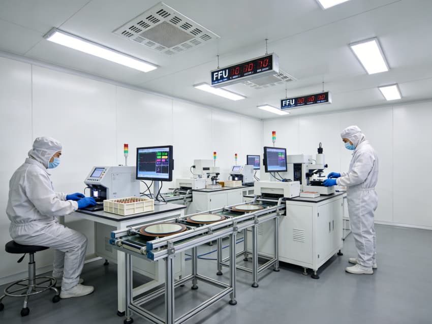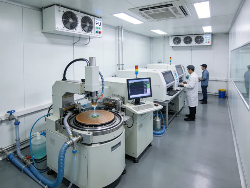 白色墻面采用工業級高潔凈抗菌涂層,推行無縫拼接與高精度找直工藝,陰陽角采用R60圓弧倒角設計,徹底消除積塵死角。廠房科學劃分光刻區、蝕刻區、沉積區、封裝測試區等核心區域,光刻區配備百級層流凈化與恒溫恒濕系統,溫濕度誤差控制在±0.2℃、±2%RH內;蝕刻區增設防微振阻尼墊層與專用廢液收集管線;各區域均預留智能化設備接口與屏蔽防護裝置,全方位保障芯片制造的精準性與穩定性。
