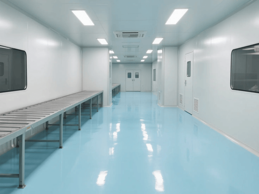 本方案嚴格遵循ISO14644-1Class7潔凈標準,采用淺藍色彩鋼板與啞光白環氧樹脂構建主體空間,打造兼具科技美感與功能性的生產環境。圍護系統選用50mm厚抗菌彩鋼板,表面經特殊涂層處理,具有優異的防塵抗靜電性能,所有接縫處采用圓弧過渡工藝處理,確保無死角清潔。