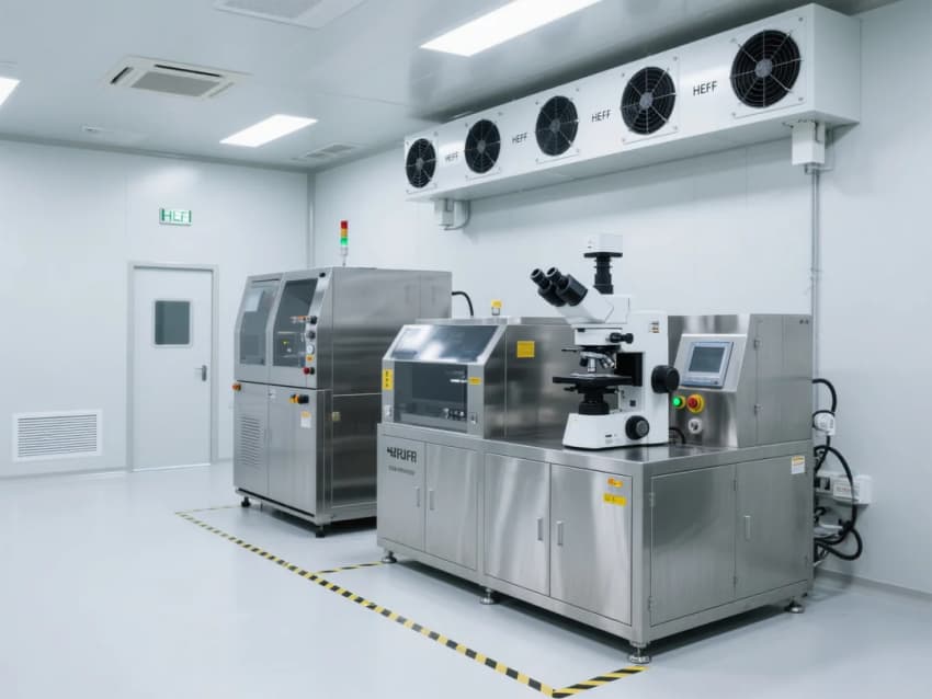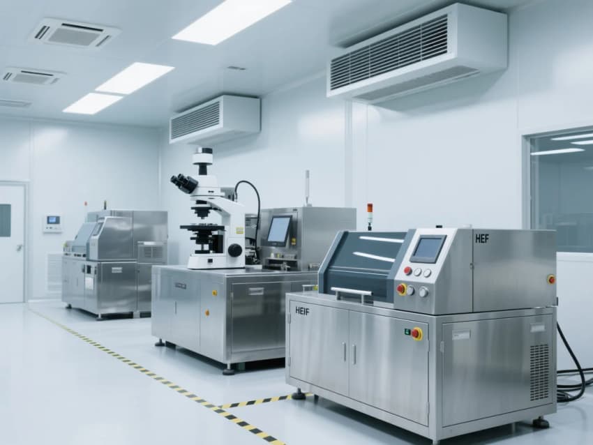 天花采用模塊化FFU(風(fēng)機(jī)過濾單元)系統(tǒng),配合高效HEPA過濾器,維持穩(wěn)定的氣流組織與潔凈度。設(shè)備區(qū)采用淺灰色不銹鋼圍擋,與白色潔凈墻面形成視覺區(qū)分,同時便于日常清潔維護(hù)。嵌入式LED無影燈帶提供均勻照明,減少作業(yè)陰影。整體設(shè)計強(qiáng)調(diào)功能性、安全性與可持續(xù)性,滿足電子光學(xué)制造的高標(biāo)準(zhǔn)環(huán)境需求。
