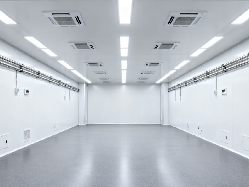 內(nèi)部6個(gè)生產(chǎn)車間均為無(wú)設(shè)備空曠布局,按百級(jí)潔凈標(biāo)準(zhǔn)建設(shè):地面鋪設(shè)防靜電環(huán)氧自流平,墻面采用無(wú)顆粒潔凈彩鋼板,陰陽(yáng)角做R30圓弧處理杜絕積塵;柱網(wǎng)間距設(shè)為9米,預(yù)留光刻機(jī)、晶圓檢測(cè)設(shè)備等重型設(shè)備安裝點(diǎn)位;頂部整合恒溫恒濕系統(tǒng)、高效空氣過(guò)濾器及防頻閃LED照明,所有管線暗藏于吊頂內(nèi),最大化釋放空間高度,為芯片晶圓制造、封裝測(cè)試等核心環(huán)節(jié)提供超潔凈、高穩(wěn)定的專屬生產(chǎn)環(huán)境。