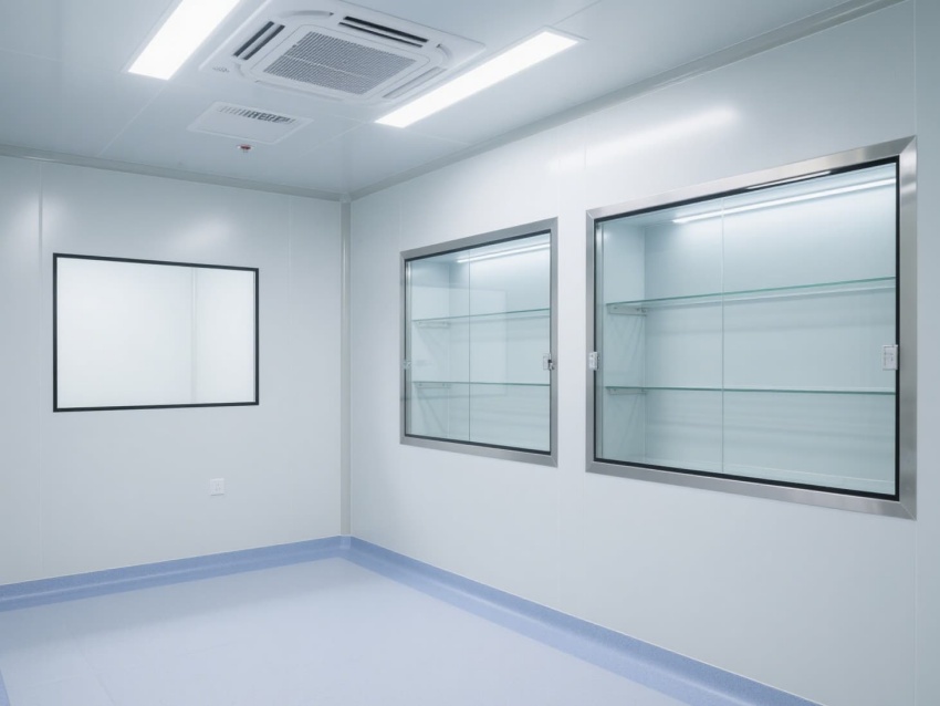 實驗室以白色抗菌彩鋼板構建墻體與吊頂,搭配淺藍灰色防靜電環氧地坪,整體色調簡潔明快。墻面與地面的圓弧角設計避免積塵,便于高頻次消毒清潔。頂部高效過濾器形成單向流氣流,每小時15-20次空氣置換,維持室內正壓以防外界污染。?